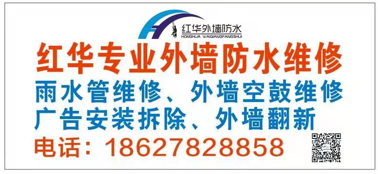 红华外墙防水专业从事防水补漏,外墙漏水维修,外墙落水管维修,广告牌安装拆除,外墙瓷砖空鼓脱落维修等一切工程防水施工与维修。